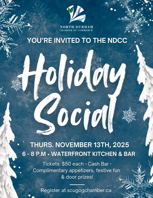 You're invited to the North Durham Chamber of Commerce Holiday Social on Thursday, November 13th, 2025. This festive gathering will be held at the cozy and scenic Waterfront kitchen, located at 150 Water St in Port Perry.