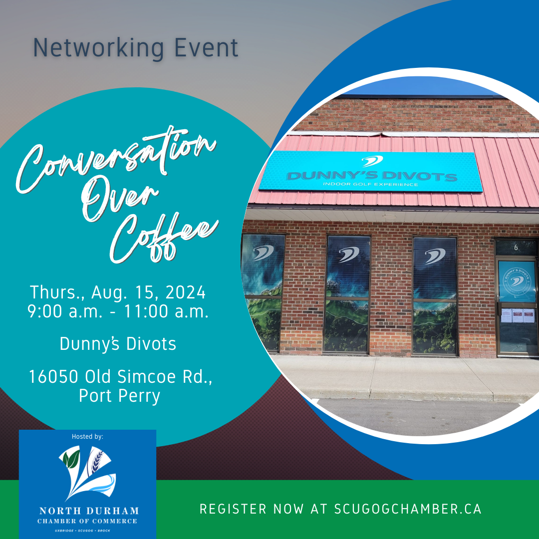 Start your morning with great company and a delicious cup of coffee at Dunny’s Divots! Conversation Over Coffee is a networking event that brings together members of the North Durham Chamber of Commerce community for a relaxed and engaging start to the day. It's free and open to everyone. Join us on Thursday, August 15, 2024, from 9:00 a.m. to 11:00 a.m. at 16050 Old Simcoe Rd., Port Perry!🔵 Conversation Over Coffee - Dunny's Divots