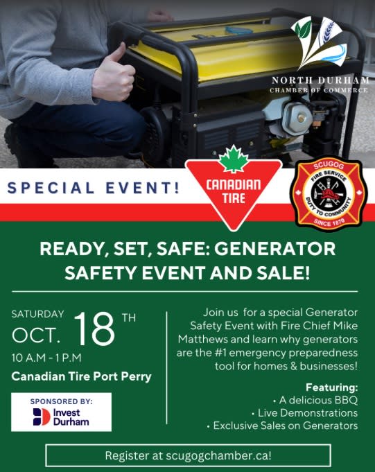 Join us for a special Generator Safety Event with Fire Chief Mike Matthews in partnership with your local Port Perry Canadian Tire. We will learn why generators are the #1 emergency preparedness tool, catch a live demo, grab a bite to eat and take advantage of an exclusive Generator Sale!